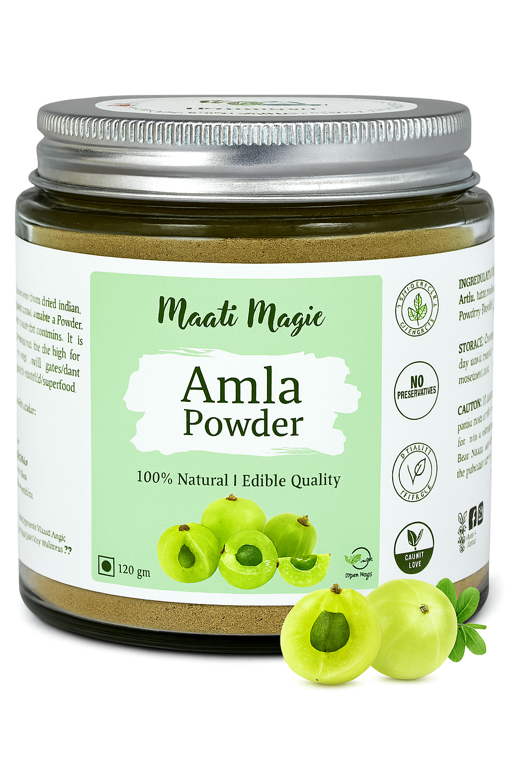 Maati Magic’s Amla Powder is a nutrient-rich superfood packed with Vitamin C, antioxidants, and essential minerals. It supports hair health, skin glow, digestion, and immunity. Amla powder is edible and can be consumed or applied topically for its numerous health and beauty benefits.