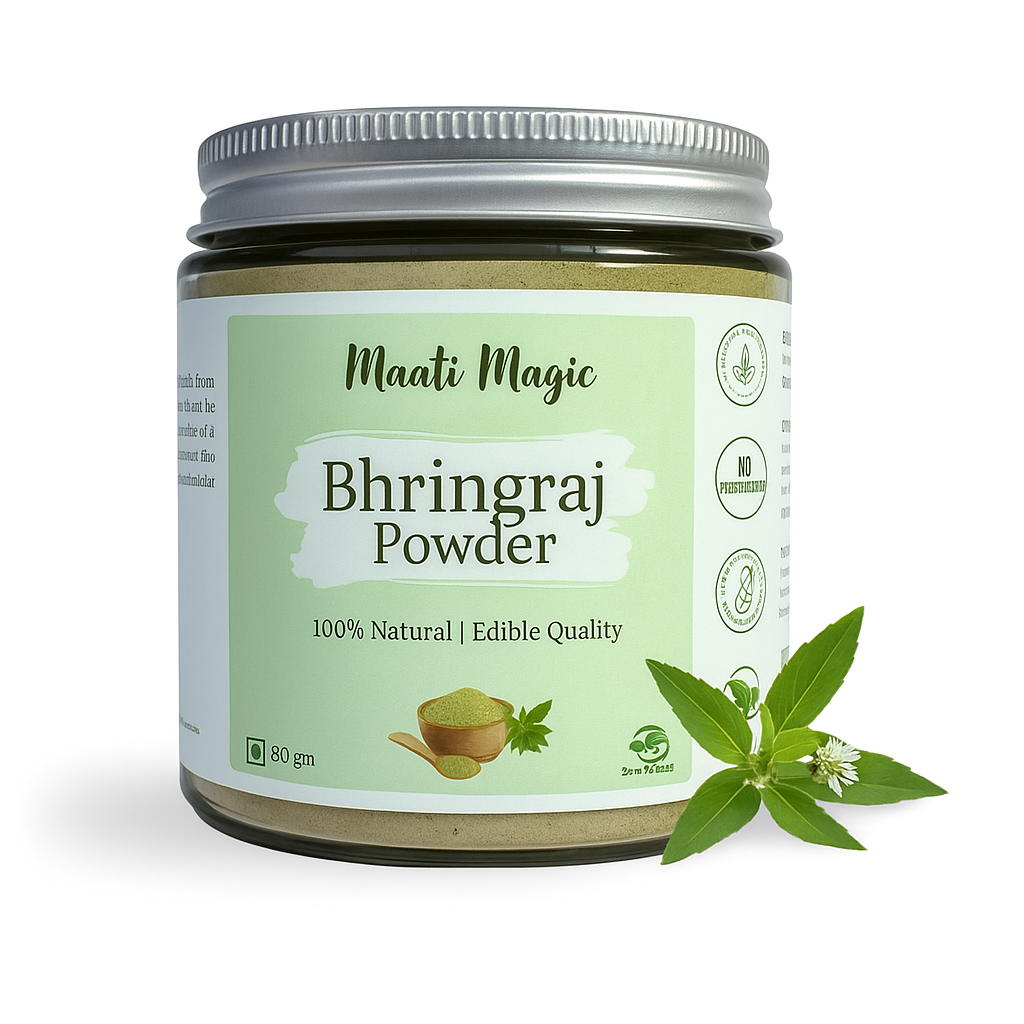 Maati Magic’s Bhringraj Powder is a powerful Ayurvedic herb known for its benefits in both hair care and overall wellness. Traditionally used for hair growth, scalp nourishment, and preventing premature greying, it is also edible and beneficial for liver health, digestion, and immunity. Rich in essential nutrients, it supports holistic well-being.