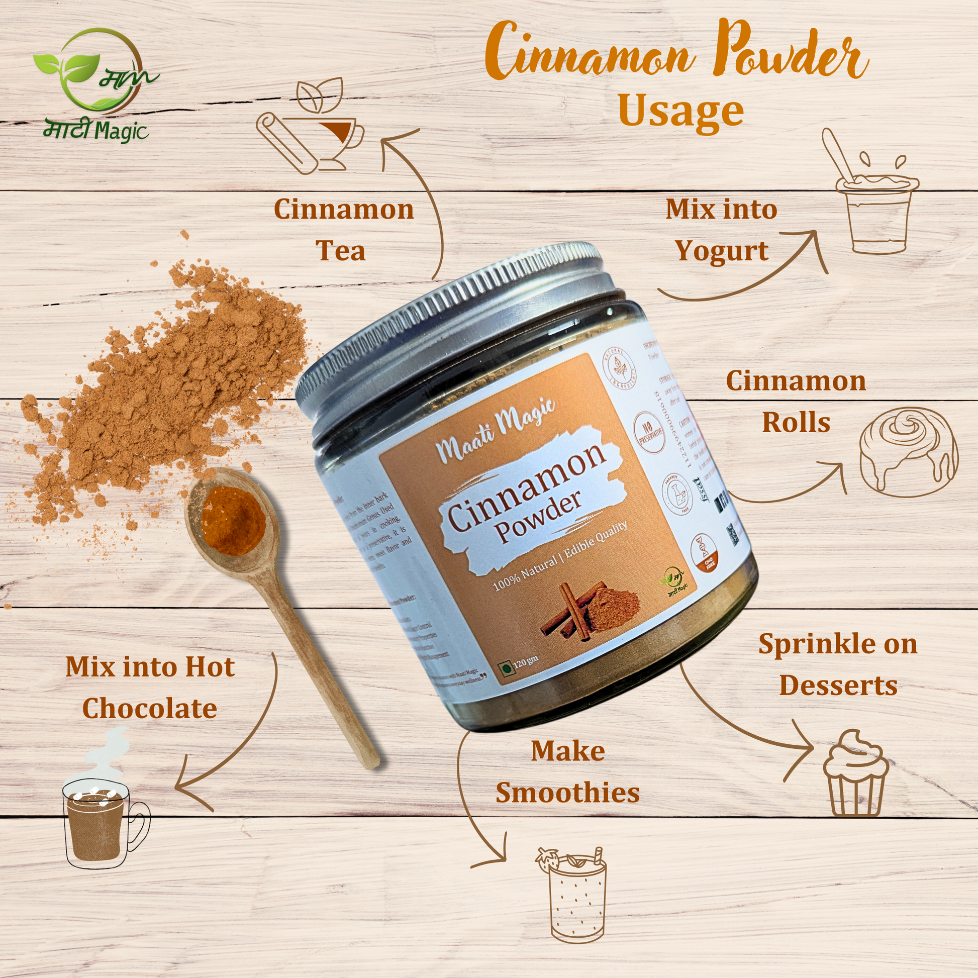 Add 1/4 to 1/2 tsp of cinnamon powder to smoothies, yogurt, or oatmeal. It can also be sprinkled over baked goods, hot beverages, and savory dishes for a comforting taste.